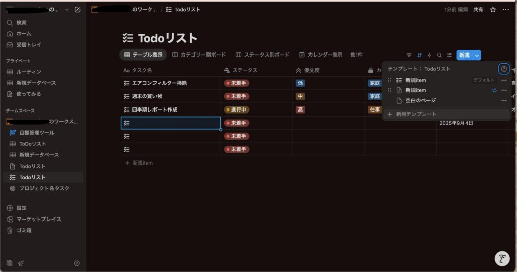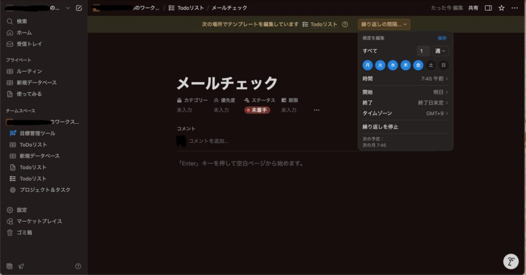 DB上の→「新規」の青いボタン→「+新規テンプレート」でルーティンなどを登録しておくことができます。