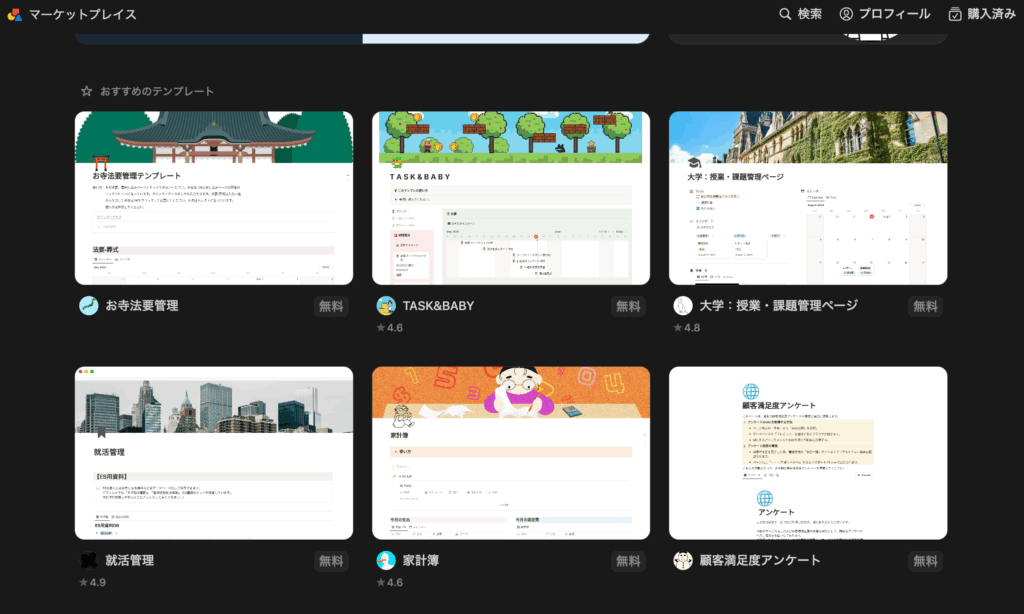 日本語テンプレも豊富。複製後にプロパティ名を自分の言葉に置き換えたり、挿入されている画像を差し替えるだけで一気に“自分のもの”になります。