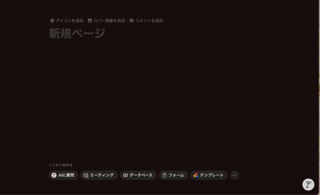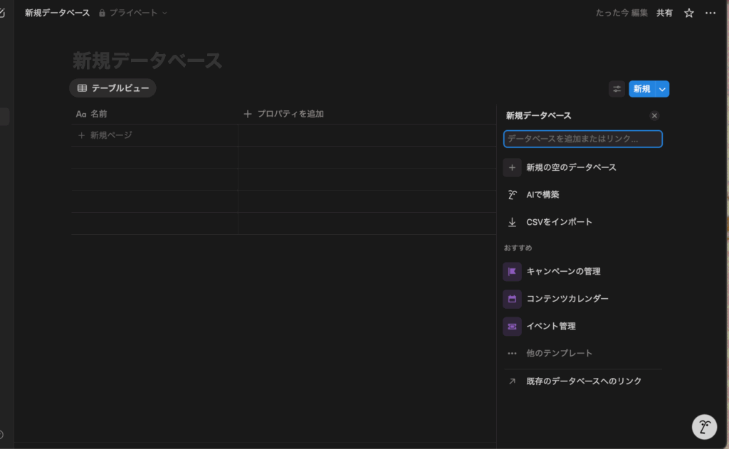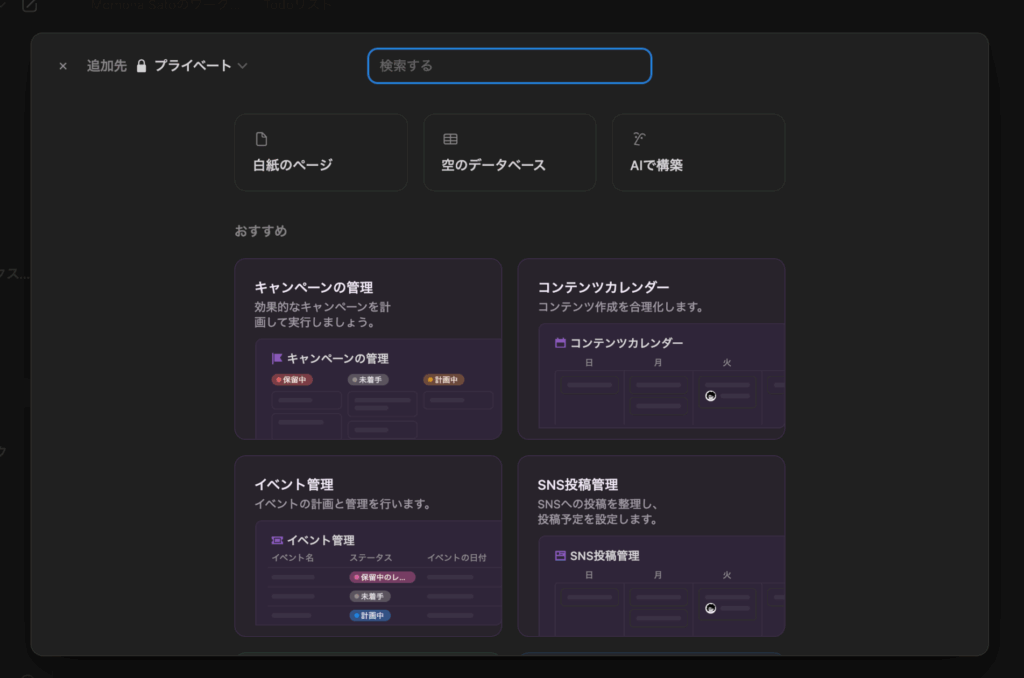 Notionには、AIの機能があり、自分の作りたいものをどう作れば良いかわからない場合は、Notion内にある「AIで作成」という機能を使うのがおすすめです。